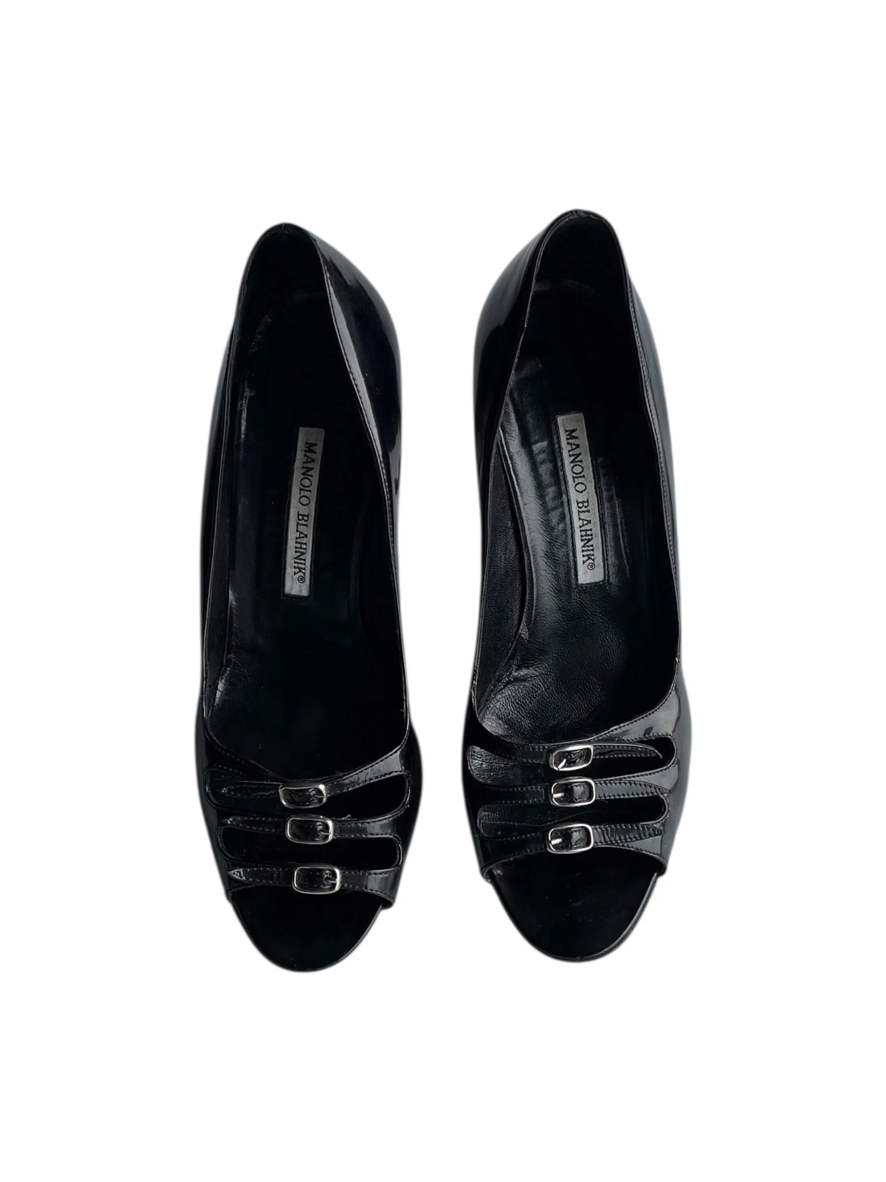 Hardware: Silver buckles on the straps of each shoe